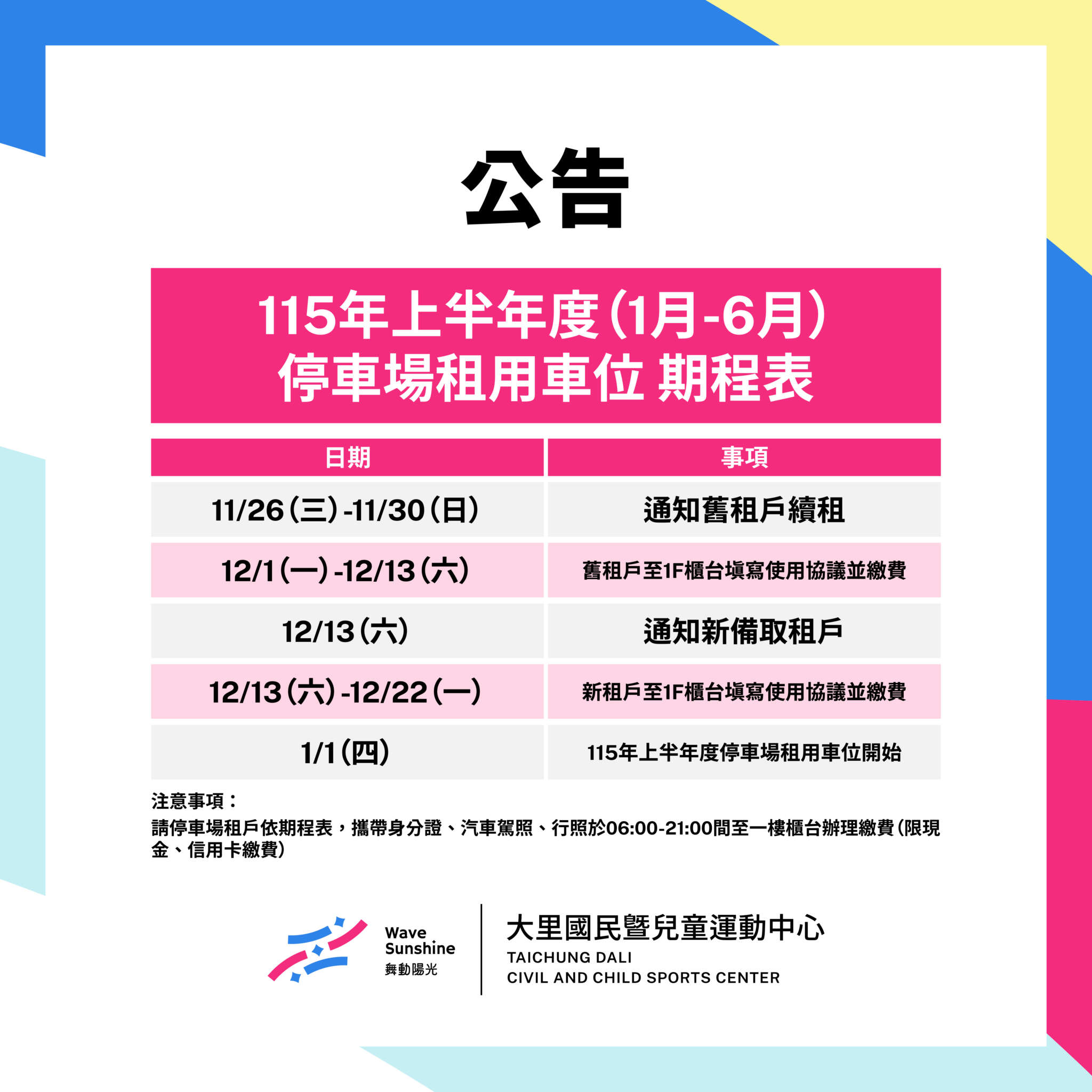 【公告】115年上半年度(1-6月)停車場租用車位 期程表