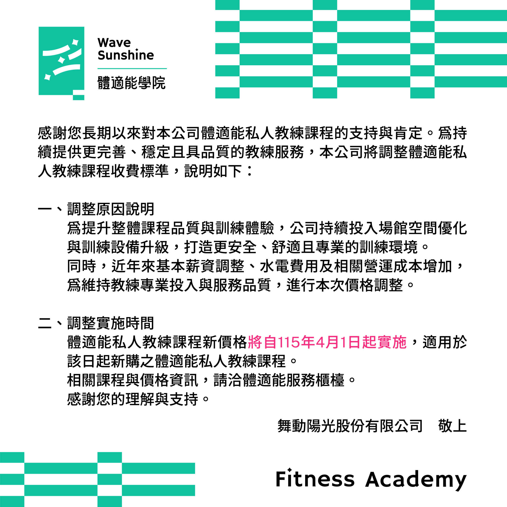 2026-02-23 臺中市大里國民暨兒童運動中心 in 訊息公告 瀏覽人數 15 【體適能私人教練課程費用調整說明】 親愛的學員您好 感謝您一直以來對本中心體適能私人教練課程的支持與信任 💛 為了持續提升課程品質、教練服務與更優質的運動空間,並因應近年營運成本增加,我們將調整體適能私人教練課程收費標準。 📌 新價格將自民國 115 年 4 月 1 日起實施 並適用於該日起新購之私人教練課程。 造成不便我們深感抱歉,也謝謝您的理解與支持。 我們會持續用更好的服務與品質回應您的信任 🙏