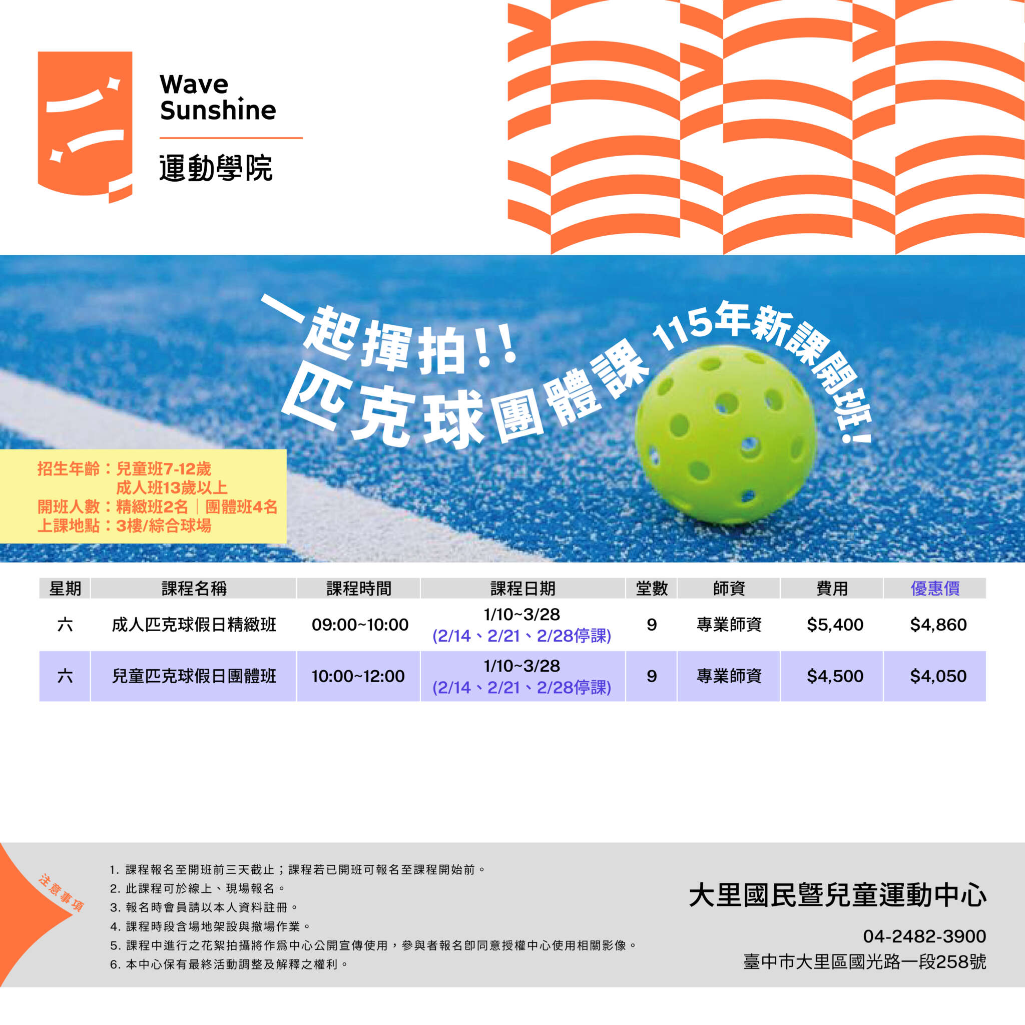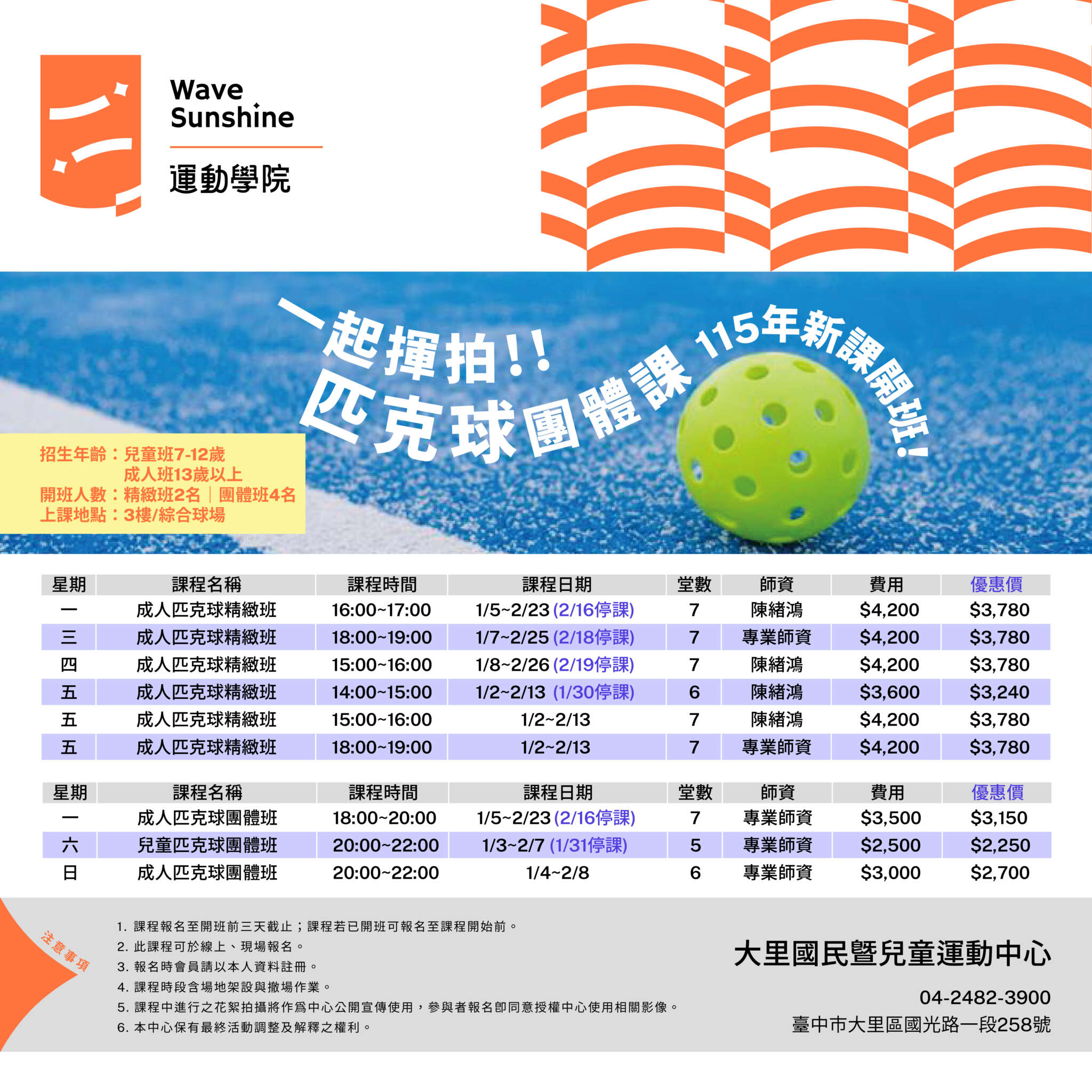 2025-12-24 臺中市大里國民暨兒童運動中心 in 最新活動 瀏覽人數 87 大家敲碗的【匹克球期課】正式登場! 因為體驗課反應太・好・了 115 年 1–2 月雙月期課直接開好開滿 時段升級,選擇更多,這次真的比較好排課了 課程對象一次到位 13 歲以上【成人班】 7–12 歲【兒童班】 晚間黃金時段超搶手 想下班、下課來動一動的真的要快 / 歡迎聯絡我們 TEL: (04)2482-3900 #里編 ————-里運辦事處資訊欄————- 官方LINE→@dlcsc IG→@dlcsc_ 線上預約→https://bwd.xuanen.com.tw/wd14.as
