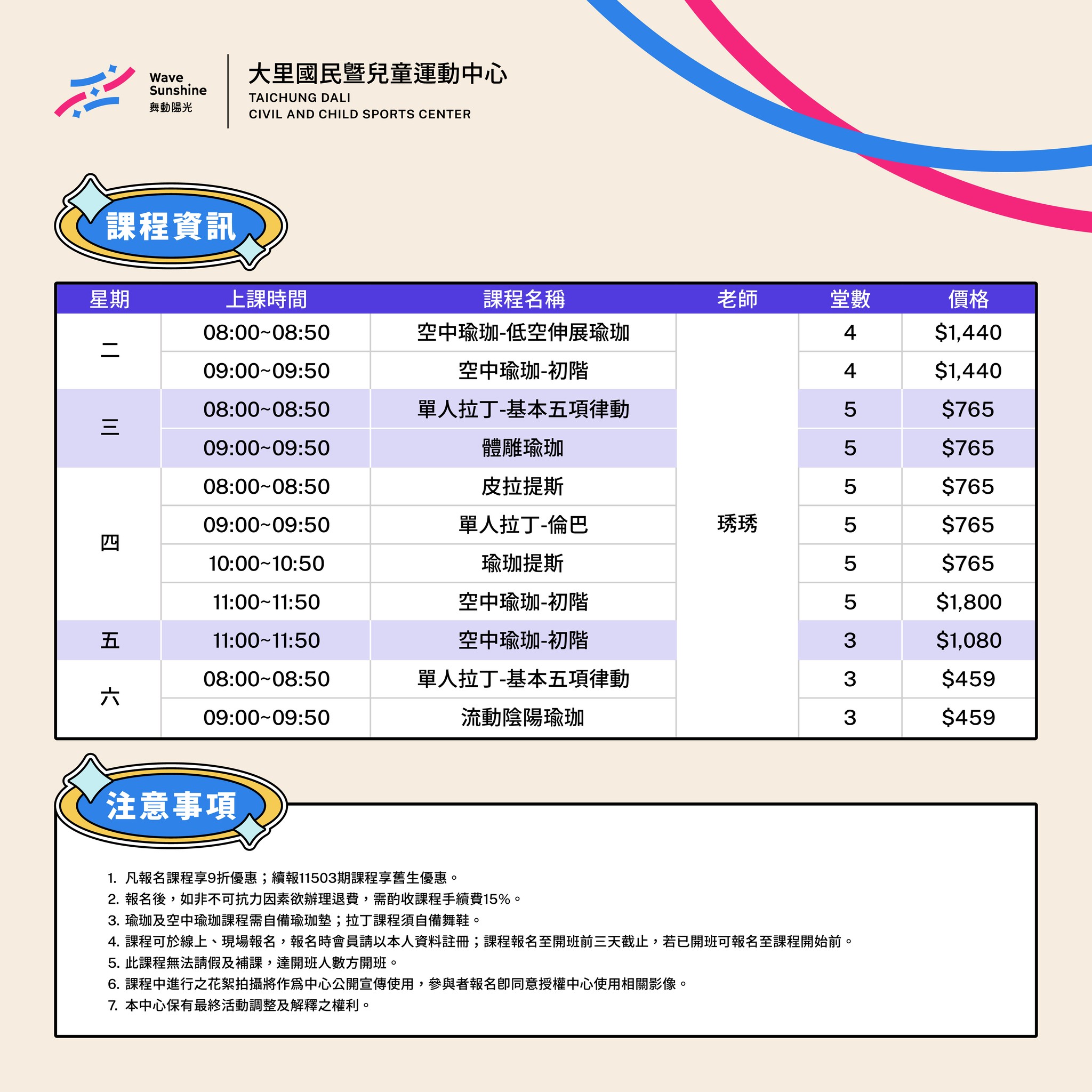 2026-03-29 臺中市大里國民暨兒童運動中心 in 最新活動 瀏覽人數 99 #四月 #單月課程 #新師資 單堂不夠?那就整個月 4月單月課程開放報名! 新老師【琇琇】強勢登場 從地面到空中 一次解鎖你的身體潛力 *勘誤通知 週三/四的課程皆往後一週( 第一堂課為4/8、4/9) / 歡迎聯絡我們 TEL: (04)2482-3900 #里編 ————-里運辦事處資訊欄————- 官方LINE→@dlcsc IG→@dlcsc_ 線上預約→https://bwd.xuanen.com.tw/wd14.aspx