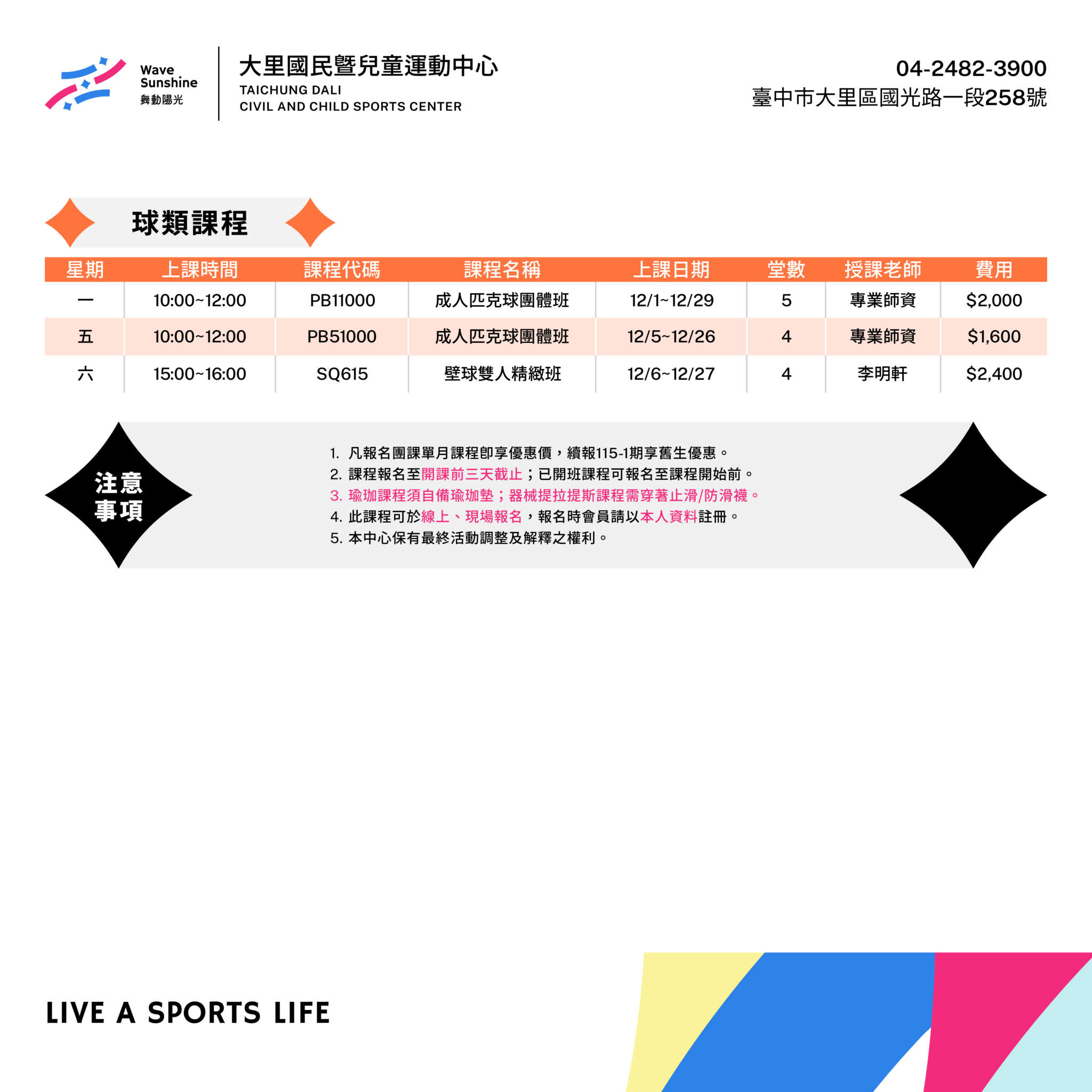 2025-11-25 臺中市大里國民暨兒童運動中心 in 最新活動 瀏覽人數 209 【12 月單月課程全上線!】 想變強、變瘦、變有趣? 我們課表都幫你配好了最新最夯都在這邊 器械皮拉提斯:雕線條、穩核心,一堂下來直接感受「身體醒了」 成人匹克球:0 基礎也能玩得超開心,新手友善度直接滿分 12 月限定優惠價,一次體驗多種課程的超好時機 快來把今年最後一個月留給更好的自己 / 歡迎聯絡我們 TEL: (04)2482-3900 #里編 ————-里運辦事處資訊欄————- 官方LINE→@dlcsc IG→@dlcsc_ 官網→https://dlcscwdyg.com.tw/ 線上預約→https://bwd.xuanen.com.tw/wd14.as