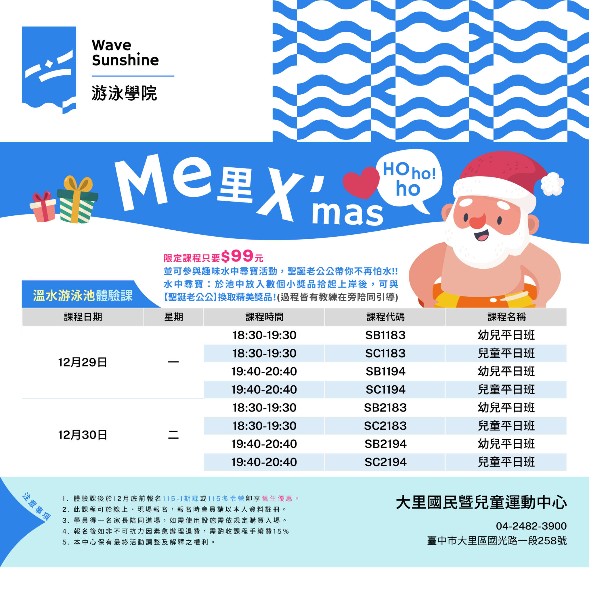 2025-12-11 臺中市大里國民暨兒童運動中心 in 最新活動 瀏覽人數 286 ME 里 X’mas|只要 $99 游泳體驗課! 里運泳池皆為29-31度的溫水游泳池 並由里運專業游泳教練團隊授課 幼兒|兒童單日體驗課 12/29、12/30 多時段任選 超值 $99 就能體驗完整課程+趣味遊戲 名額有限,快來報名! / 歡迎聯絡我們 TEL: (04)2482-3900 #里編 ————-里運辦事處資訊欄————- 官方LINE→@dlcsc IG→@dlcsc_ 線上預約→https://bwd.xuanen.com.tw/wd14.as