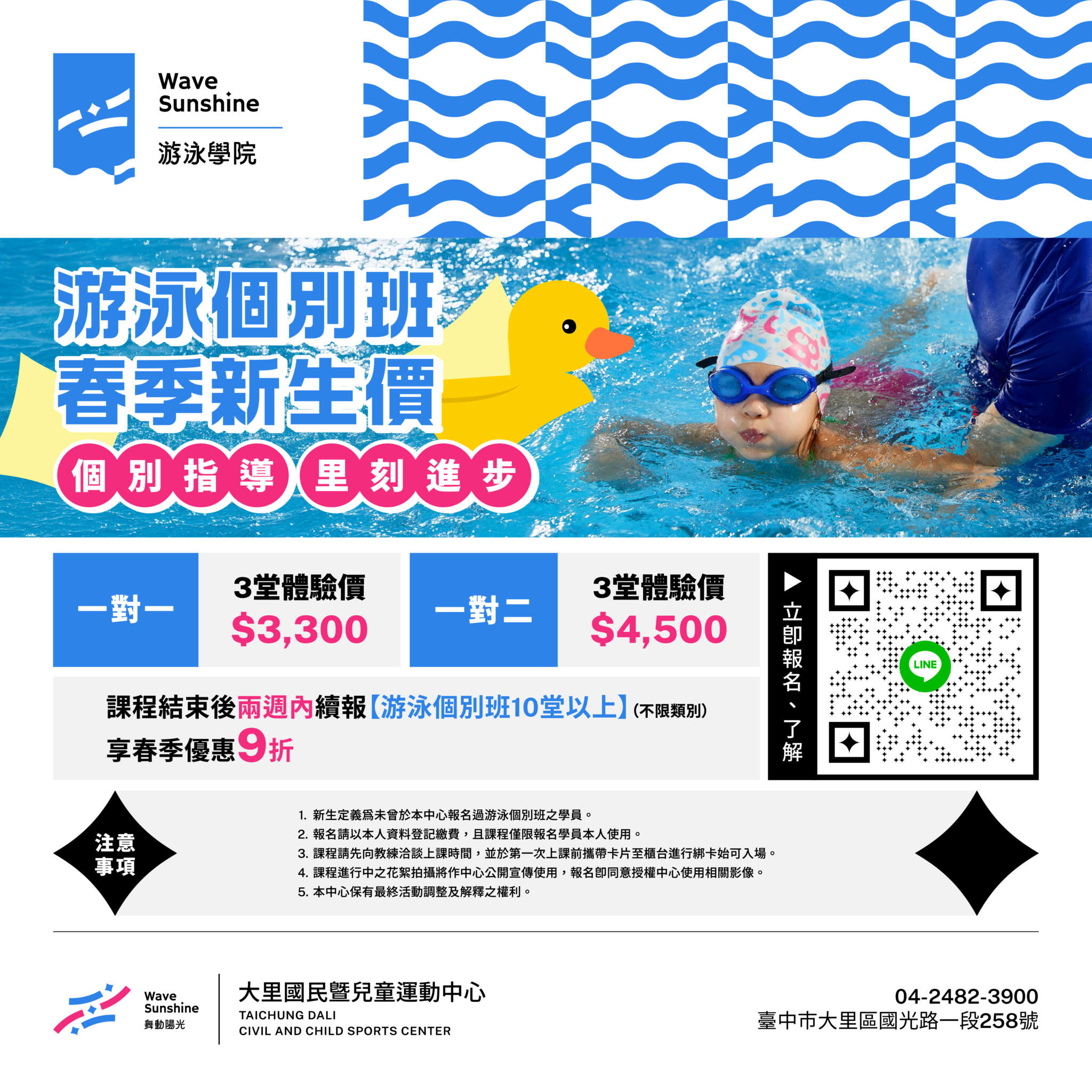 2026-04-14 臺中市大里國民暨兒童運動中心 in 最新活動 瀏覽人數 144 游泳其實真的很吃細節。 有時候不是孩子不努力 而是動作只要差一點點 像踢水角度、換氣時機、身體位置 只要有一個地方沒抓好 就會一直卡關、很難再進步 如果家裡小朋友也有遇到類似的狀況 或學一陣子但進步不明顯的 可以考慮試試個別指導 現在有體驗價 只到5/31 ▸ 一對一|3堂 $3,300 ▸ 一對二|3堂 $4,500 讓孩子用對方式學,比一直練更重要。 https://lin.ee/nUIqbz5 #游泳課程 #游泳個別班 #游泳一對一